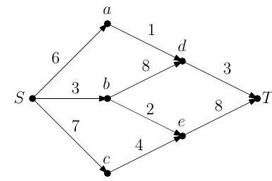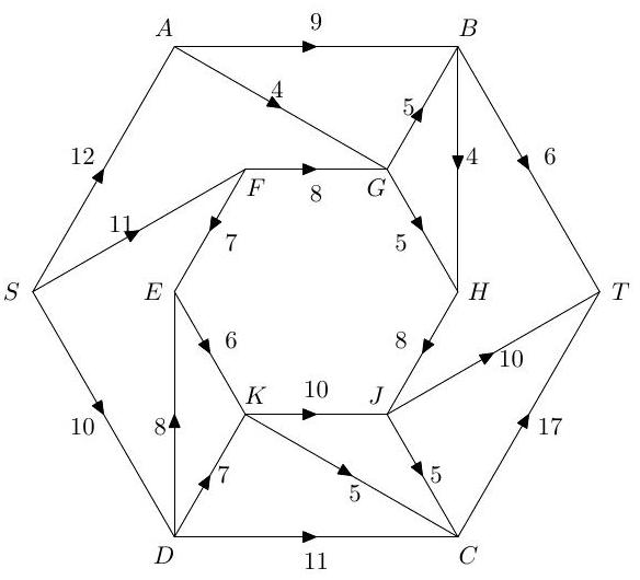 (b) (i) Apply the Ford-Fulkerson algorithm to find the maximum flow of the network illustrated below, where is the source and is the sink.