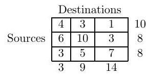 where the figures in the boxes denote transportation costs, the right-hand column denotes supplies, and the bottom row denotes requirements.