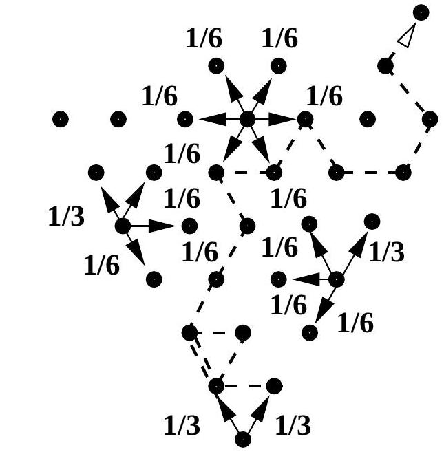 commentA particle performs a continuous-time nearest neighbour random walk on a regular triangular lattice inside an angle , starting from the corner. See the diagram below. The jump rates are from the corner and in each of the six directions if the particle is inside the angle. However, if the particle is on the edge of the angle, the rate is along the edge away from the corner and to each of three other neighbouring sites in the angle. See the diagram below, where a typical trajectory is also shown.