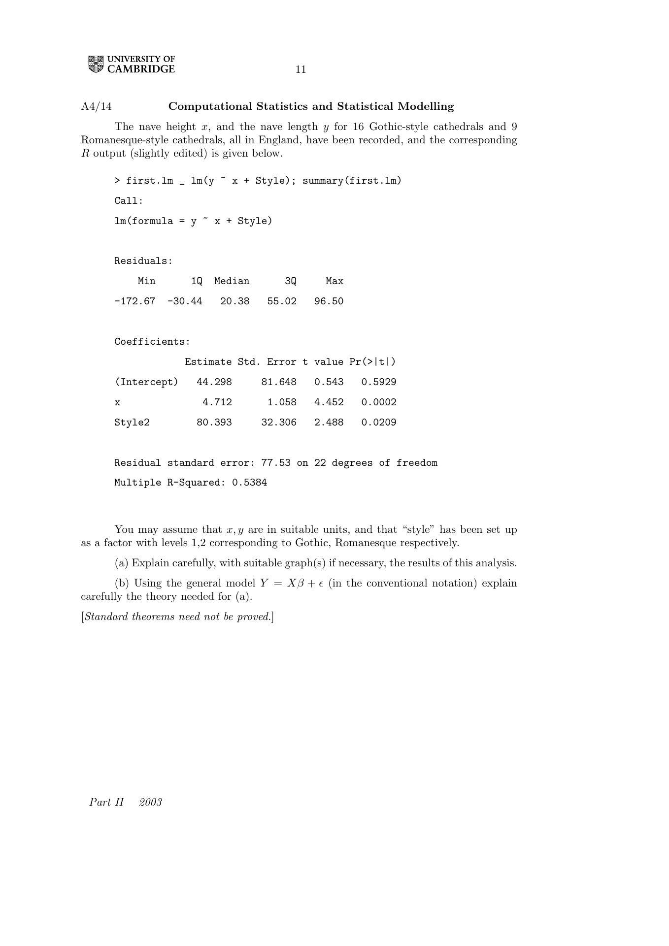 You may assume that are in suitable units, and that "style" has been set up as a factor with levels 1,2 corresponding to Gothic, Romanesque respectively.