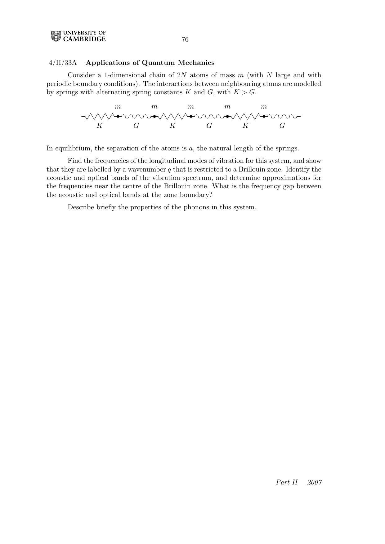 Find the frequencies of the longitudinal modes of vibration for this system, and show that they are labelled by a wavenumber that is restricted to a Brillouin zone. Identify the acoustic and optical bands of the vibration spectrum, and determine approximations for the frequencies near the centre of the Brillouin zone. What is the frequency gap between the acoustic and optical bands at the zone boundary?
