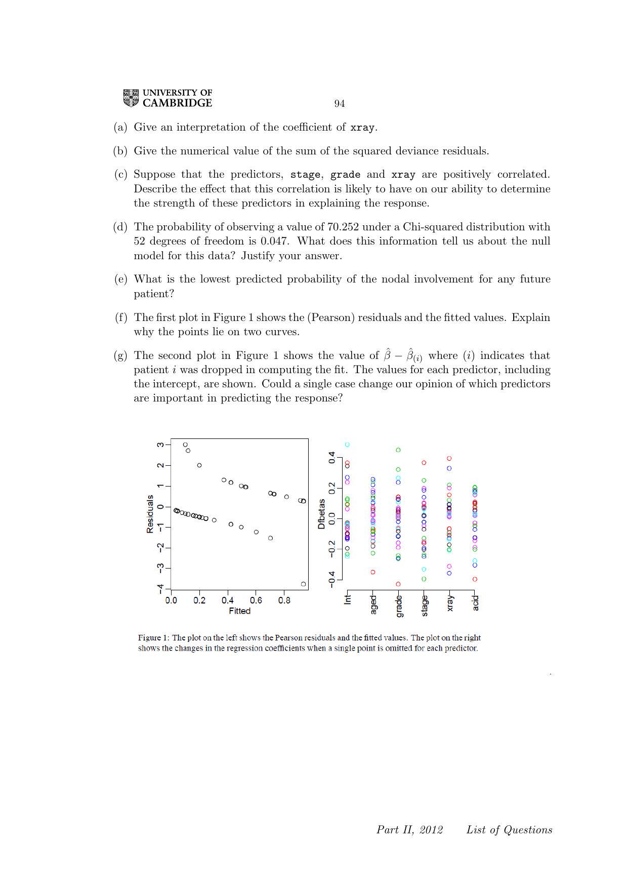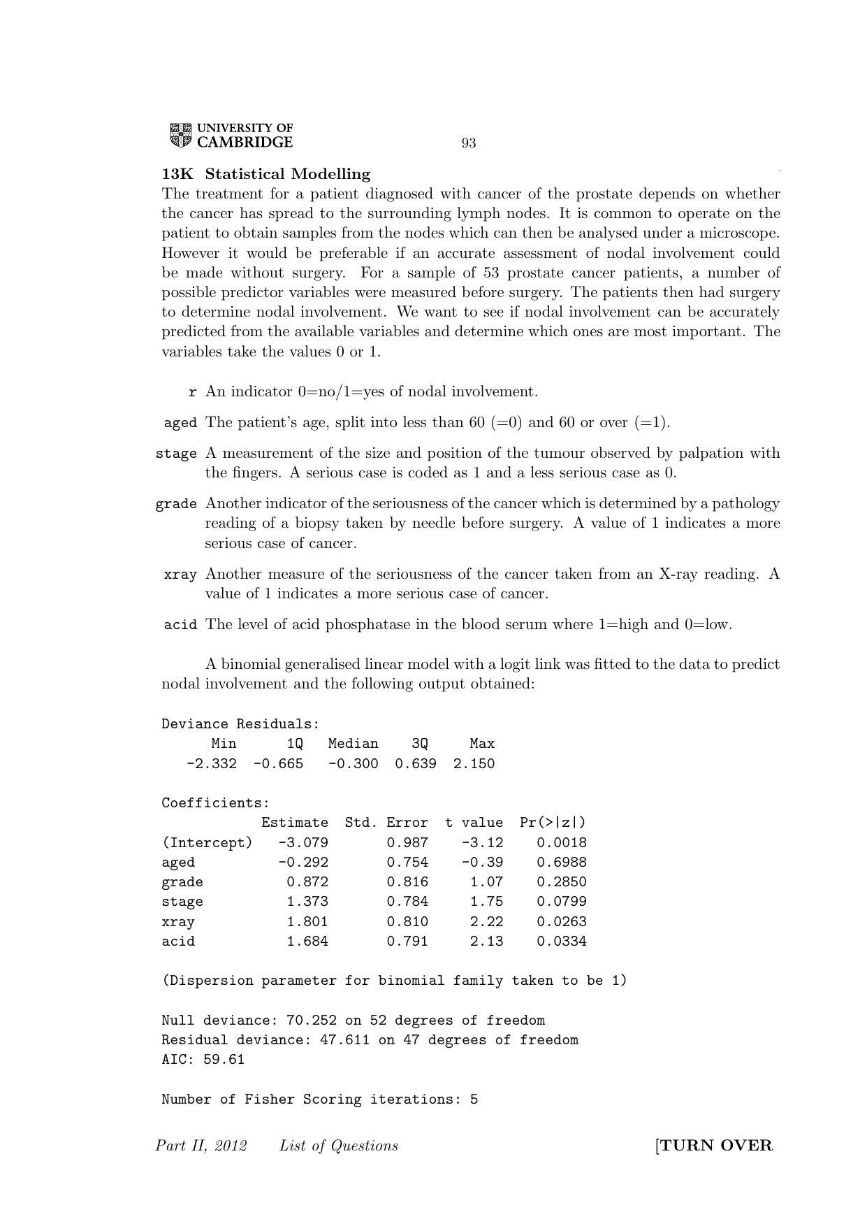 A binomial generalised linear model with a logit link was fitted to the data to predict nodal involvement and the following output obtained:
