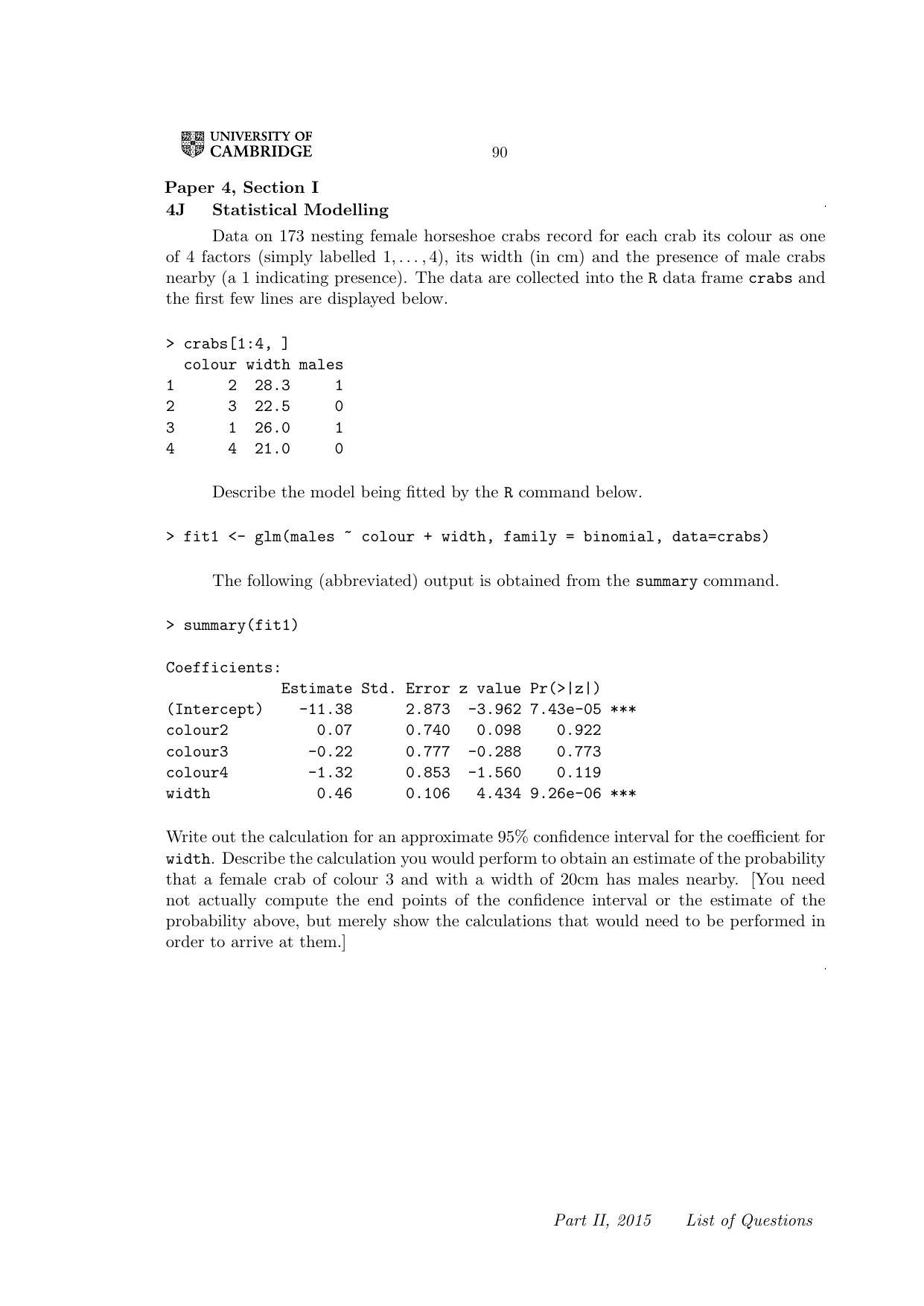 Write out the calculation for an approximate confidence interval for the coefficient for width. Describe the calculation you would perform to obtain an estimate of the probability that a female crab of colour 3 and with a width of has males nearby. [You need not actually compute the end points of the confidence interval or the estimate of the probability above, but merely show the calculations that would need to be performed in order to arrive at them.]