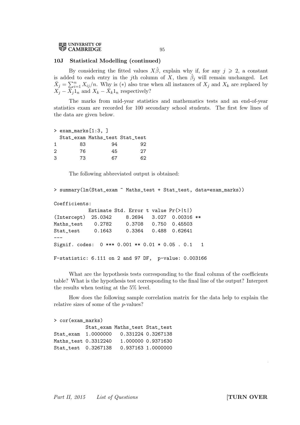 The marks from mid-year statistics and mathematics tests and an end-of-year statistics exam are recorded for 100 secondary school students. The first few lines of the data are given below.