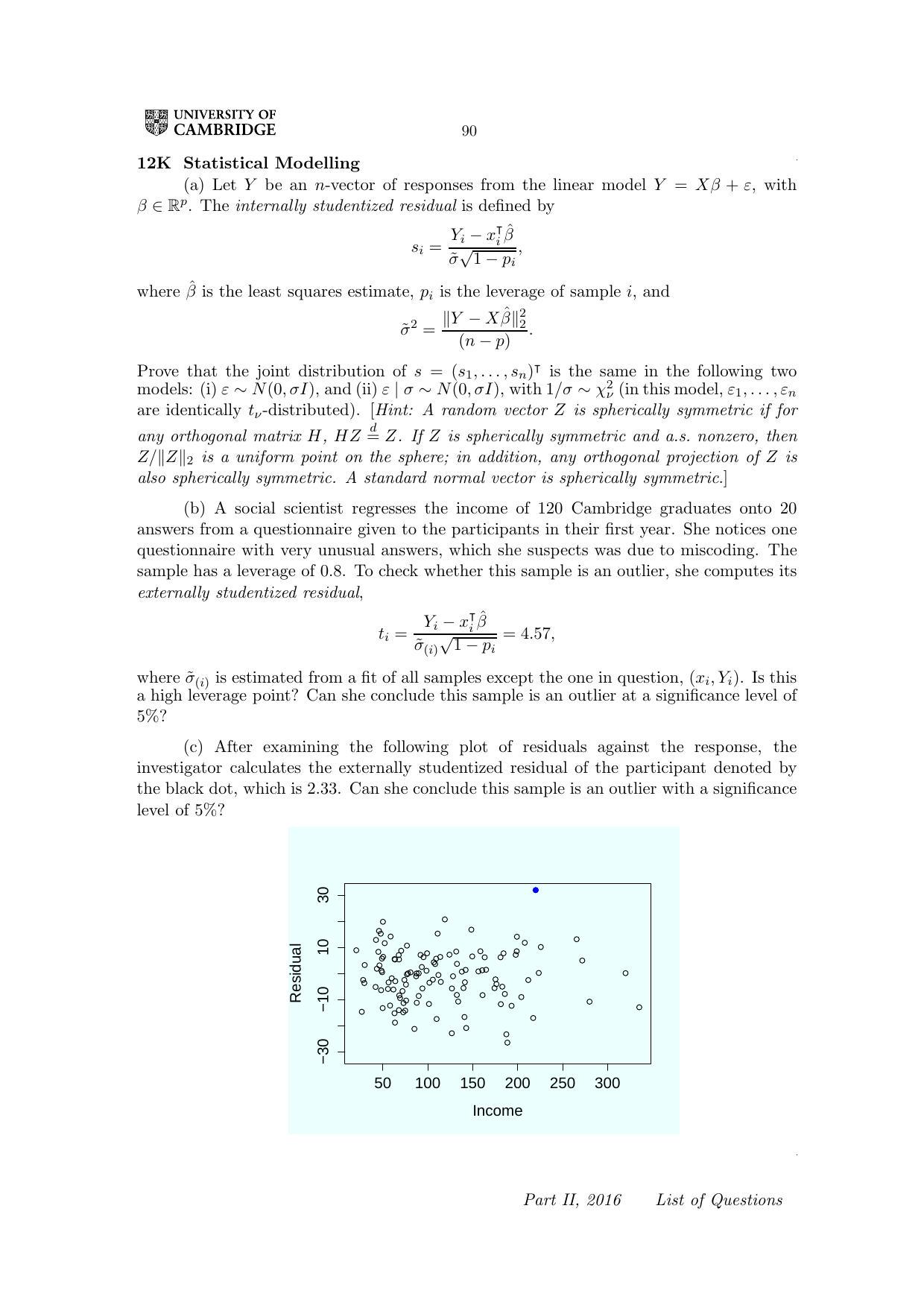 (b) A social scientist regresses the income of 120 Cambridge graduates onto 20 answers from a questionnaire given to the participants in their first year. She notices one questionnaire with very unusual answers, which she suspects was due to miscoding. The sample has a leverage of . To check whether this sample is an outlier, she computes its externally studentized residual,