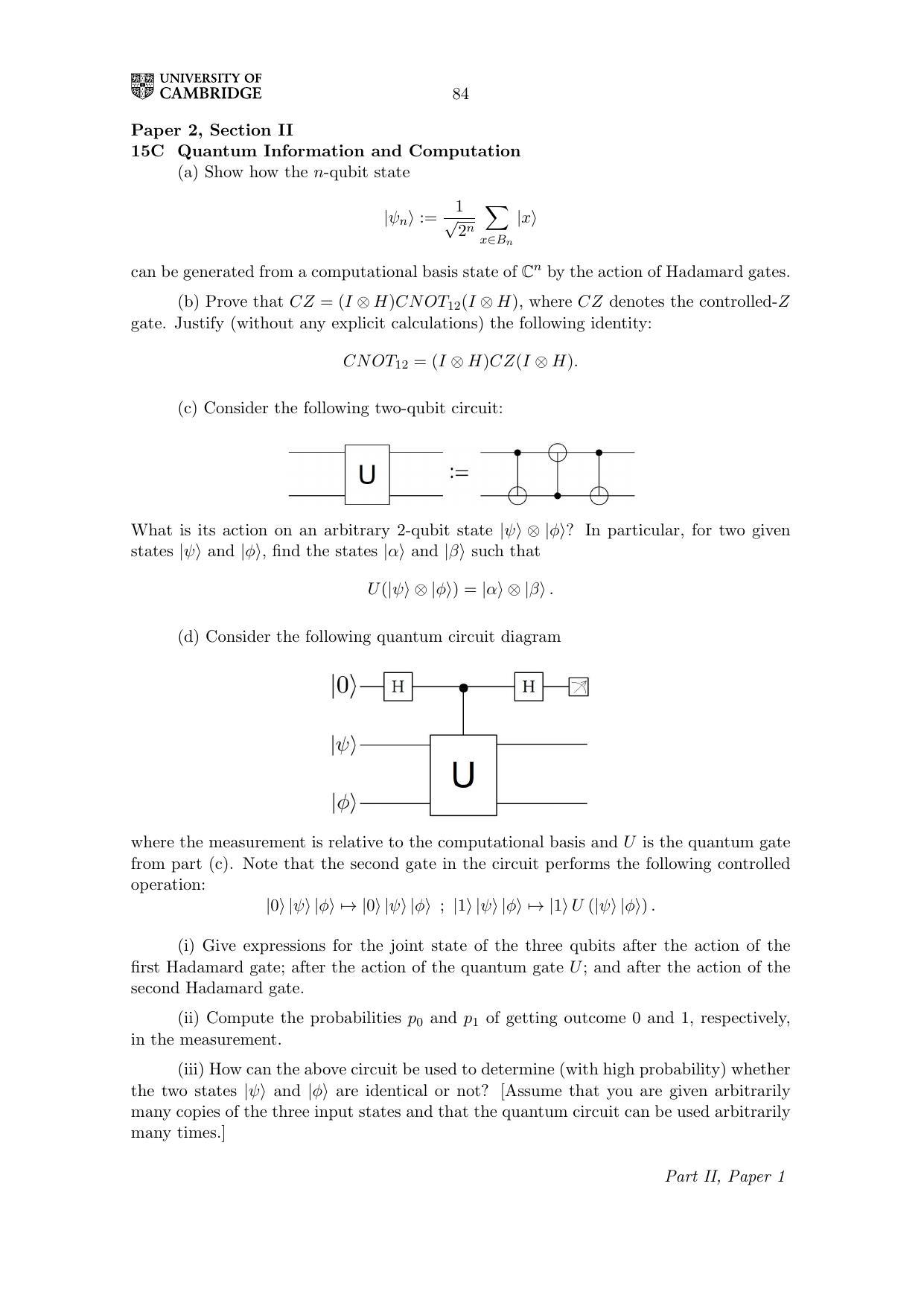 (iii) How can the above circuit be used to determine (with high probability) whether the two states and are identical or not? [Assume that you are given arbitrarily many copies of the three input states and that the quantum circuit can be used arbitrarily many times.]